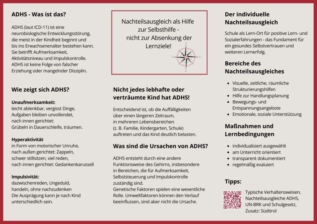 Zusätzlich erhältst du im QR-Code des Flyers eine ausführliche Darstellungen der Symptomen/Verhaltensweisen, Möglichkeiten des individualisierten Nachteilsausgleiches, Informationen zur UN-Konvention und dem Schulrecht sowie einen Sonderteil zu Südtirol.